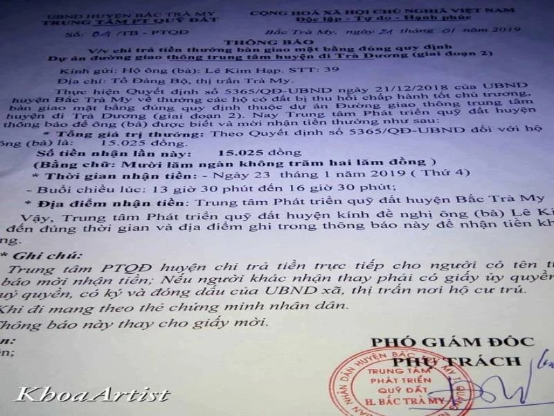 Thông báo này do ông Đặng Công Tú – Phó giám đốc phụ trách Trung tâm Phát triển Quỹ đất huyện Bắc Trà My, ký và đề nghị ông Hạp đến Trung tâm Phát triển quỹ đất huyện Bắc Trà My để nhận tiền thưởng vào ngày 23-1-2019.