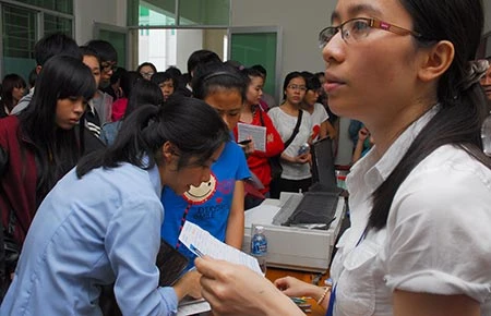 Thí sinh chỉnh sửa giấy báo thi tại Trường Đại học Sư phạm TP.HCM năm 2014. Ảnh: HTD