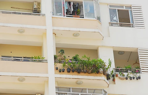Nhiều hộ dân ở chung cư mới thường treo những chậu hoa ngoài cửa sổ dễ gây nguy hiểm cho người đi đường. (Ảnh chụp ngày 20-4). Ảnh: HTD