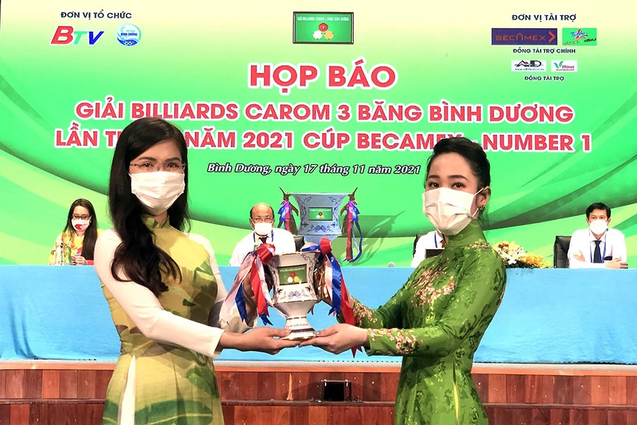 Ban tổ chức giới thiệu cúp vô địch billiards ba băng BTV Cup 2021. Ảnh: MQ