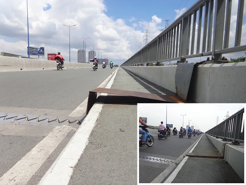 Báo Pháp Luật TP.HCM ngày 5-11 phản ánh đường bộ hành trên cầu Sài Gòn, hướng quận Bình Thạnh-quận 2, TP.HCM thiếu an toàn bởi tấm sắt bị hỏng đinh nên nhô lên khỏi mặt cầu (ảnh lớn).