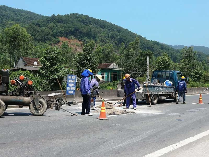 Công nhân đang sửa chữa tuyến đường BOT tránh thị xã Hồng Lĩnh, Hà Tĩnh. Ảnh: ĐẮC LAM