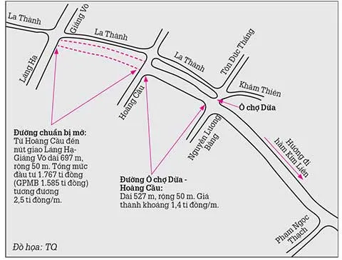 Tuy nhiên, lúc bấy giờ Hà Nội không đủ nguồn lực, kinh phí để thực hiện phương án nêu trên nên sau đó phải điều chỉnh quy hoạch. Chủ trương mới là tập trung giải phóng mặt bằng để xây dựng tuyến đường trước, triển khai chỉnh trang hai bên đường sau. Nhưng quá trình triển khai cũng không suôn sẻ do nhiều nguyên nhân chủ quan lẫn khách quan và đến bây giờ chúng ta mới thấy được bài học kinh nghiệm. Đoạn 1 Kim Liên - Ô Chợ Dừa từng được xem là “đắt nhất hành tinh”, đến đoạn Ô Chợ Dừa - Hoàng Cầu còn đắt hơn nữa. Giờ đoạn 3 từ Hoàng Cầu đến nút giao Giảng Võ - Láng Hạ chuẩn bị làm sẽ tiếp tục phá kỷ lục “đắt nhất hành tinh”, chủ yếu do chi phí giải phóng mặt bằng quá cao.