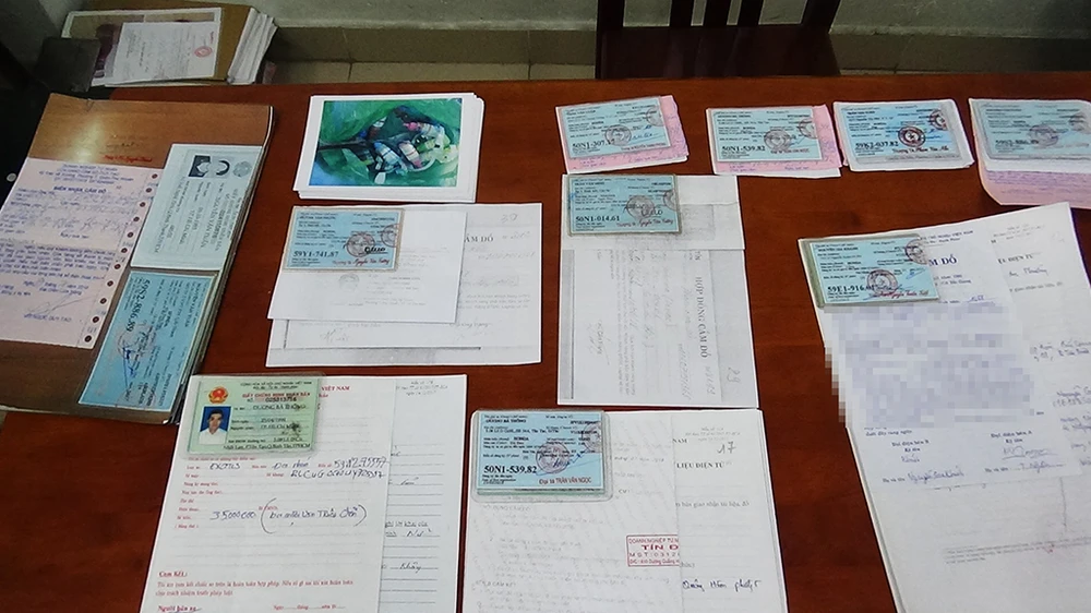 Khoa và Hoàng được xác định làm giả nhiều hồ sơ, giấy tờ xe sau đó cho đàn em mang tới tiệm cầm đồ để cầm cố. Ảnh: CA