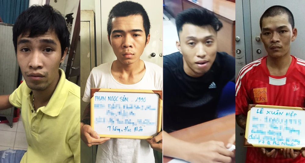 Hùng, Sơn, Hoàng và Hiệp (từ trái qua) bị bắt khẩn cấp để điều tra. Ảnh: CA
