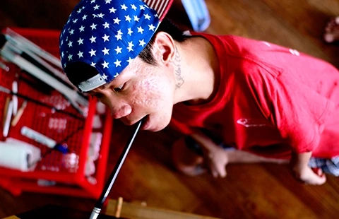 Lê Minh Châu ngậm cọ vẽ, cúi đầu chấm một ít màu đã pha, rồi quệt những đường nét chuyên nghiệp lên khung tranh. Những bức tranh phong cảnh đẹp như mơ, những bức họa chân dung chân thật và sinh động chẳng khác ảnh chụp, những khuôn tranh trừu tượng hút mắt với đường nét và sắc màu… Gia tài tranh của Châu dày lên sau gần 10 năm học tập và sáng tạo miệt mài.