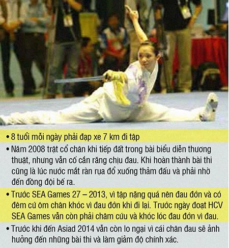 Mẹ Hoa của Thúy Vi kể lại đêm đêm bà và chồng nhiều khi cứ thay nhau xoa bóp cho con gái và thức cùng con để chia sẻ nỗi đau. Thậm chí bà Hoa còn bật mí lần con gái mang HCV đầu tiên về cho TTVN tại SEA Games 27 cách đây hai năm, bà cũng rất đau lòng vì hôm trước cứ nghe con rấm rức khóc vì đối chọi với nỗi đau. Bà thừa nhận sức khỏe của con gái mình từ bé đã không tốt và cái chân thì cứ như có vết tì thế mà: “Cứ bước lên sàn đấu là khuôn mặt nó lại thật tươi, thật dễ thương nhưng đâu có ai biết nhiều khi nó nén đau và cắn răng để thi đấu mà mặt vẫn cười tươi để đạt điểm cao…”.