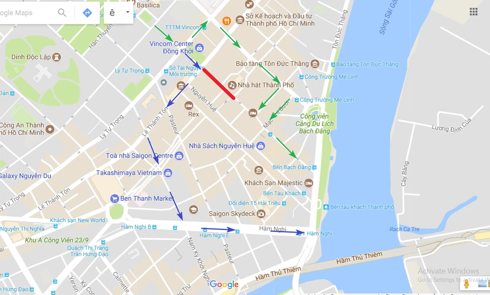 Cấm tất cả các loại xe lưu thông vào đường Đồng Khởi đoạn từ đường Lê Thánh Tôn đến đường Lê Lợi, Quận 1 trong khoảng thời gian từ 17 giờ 30 đến 21 giờ 30 ngày 26-4. Lộ trình thay thế hướng từ đường Lê Thánh Tôn đến đường Tôn Đức Thắng cụ thể như sau: