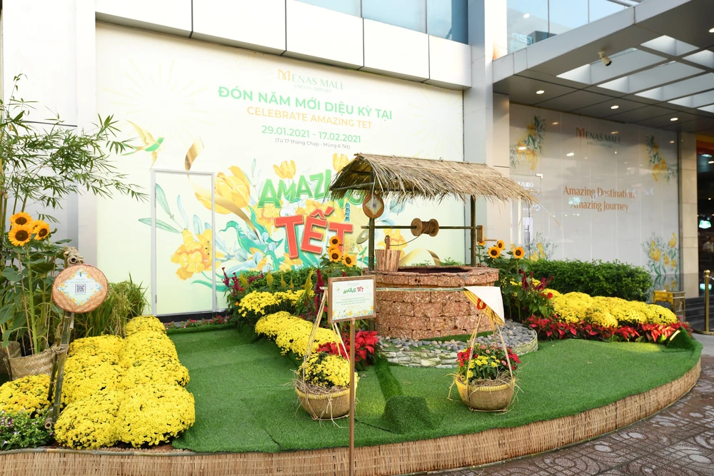 Đường hoa Amazing Tết tại trung tâm thương mại cao cấp Menas Mall Saigon Airport tọa lạc ngay cửa ngõ sân bay quốc tế Tân Sơn Nhất (60A Trường Sơn, quận Tân Bình, TP.HCM) mang đến không gian vui chơi cho những người con xa quê vơi bớt nỗi nhớ nhà, nhớ Tết quê.