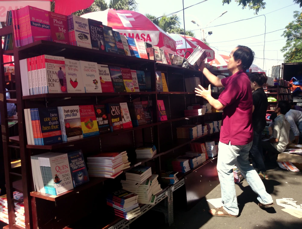 Khu vực Đường sách sẽ khai mạc vào sáng 28-1, thế nên đến thời điểm hiện tại, các hạng mục trưng bày gần như đã hoàn thiện. Nhiều đơn vị phát hành sách: Fahasa, Nhà xuất bản Kim Đồng, Công ty Phan Thị, Nhà xuất bản Trẻ… đã trưng bày sách lên kệ.