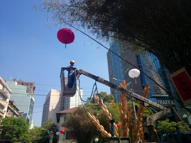 Công nhân Công ty chiếu sáng công cộng TP.HCM đi những đường điện cuối cùng cho đèn lồng ở đường hoa