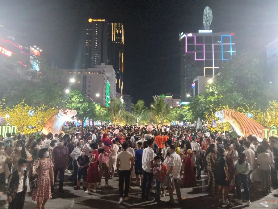 Khách tham quan đường hoa Nguyễn Huệ 2022 tối mùng 2 Tết. ẢNH: T.MY