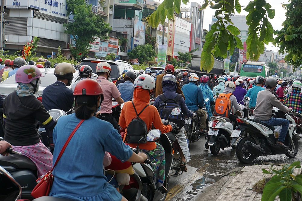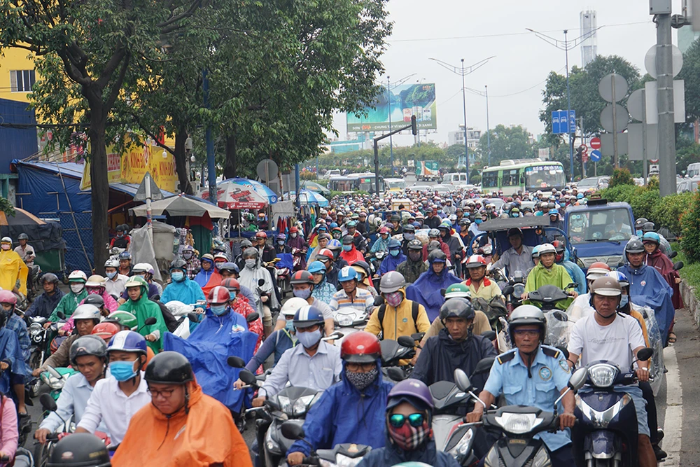 Hàng ngàn phương tiện phải đội mưa di chuyển từng chút một. Do vào giờ cao điểm, lại là ngày đầu tuần đẩy mật độ giao thông lên cao khiến đường Trường Chinh-Cộng Hòa vốn là nỗi ám ảnh về kẹt xe của người dân càng thêm kẹt.