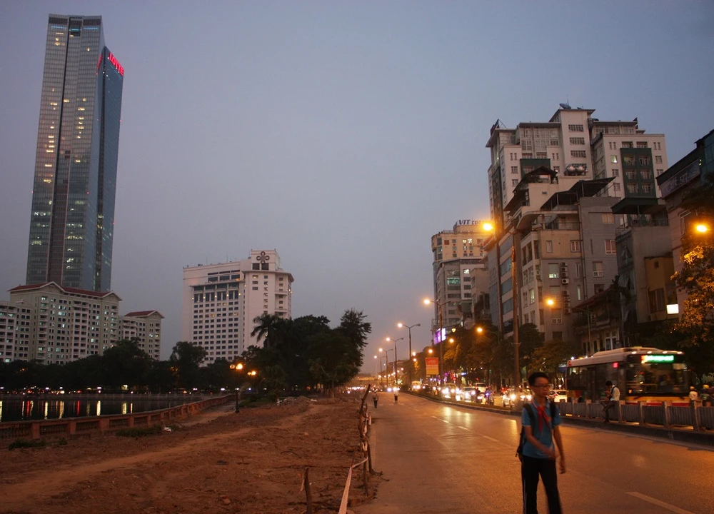 Phần đường bị cấm hiện đang chờ thi công. Người dân trong khu vực tranh thủ ra tận dụng làm nơi tập thể dục, đi bộ hoặc làm chỗ vui chơi cho trẻ.