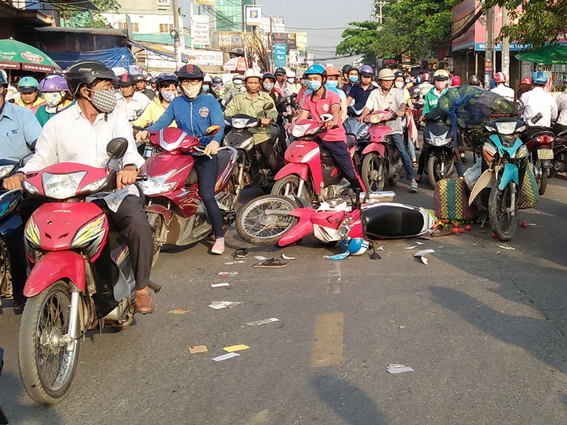 Hai xe máy tông trực diện trên đường Lê Trọng Tấn vào giờ cao điểm sáng 3-3.