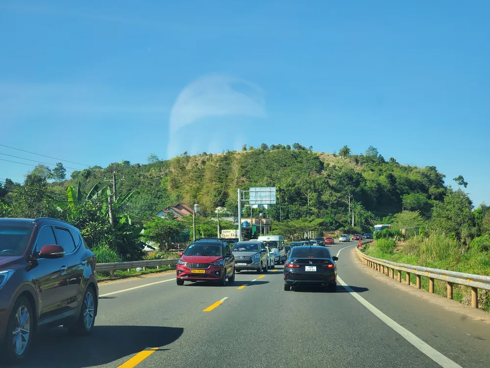Các phương tiện xếp hàng dài hơn 3 km để di chuyển qua đoạn thu phí này. Đây là tuyến đường hướng về trung tâm TP Đà Lạt.