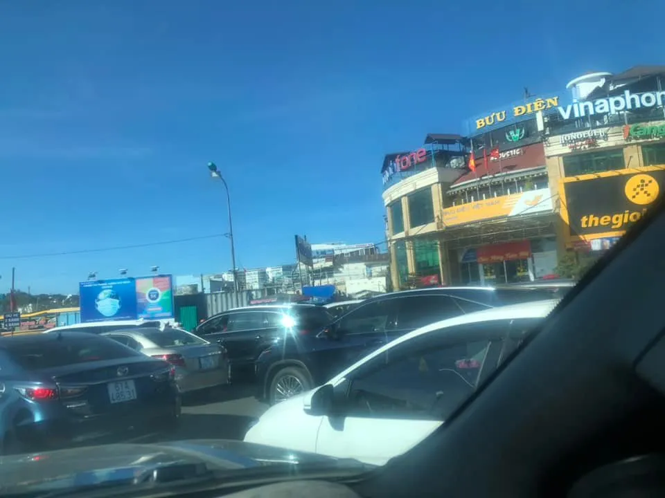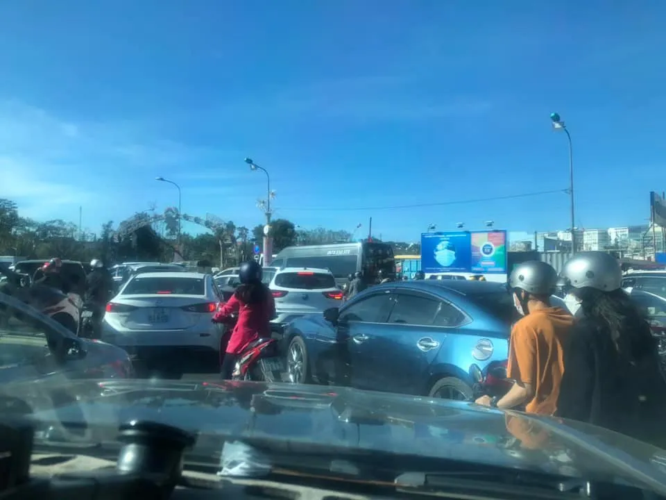 Tại TP Đà Lạt, các khu vực cửa ngõ, vòng xoay đông đúc. Tại đây tình trạng kẹt xe cũng diễn ra. Các phương tiện xếp hàng, nhúc nhích từng chút một.