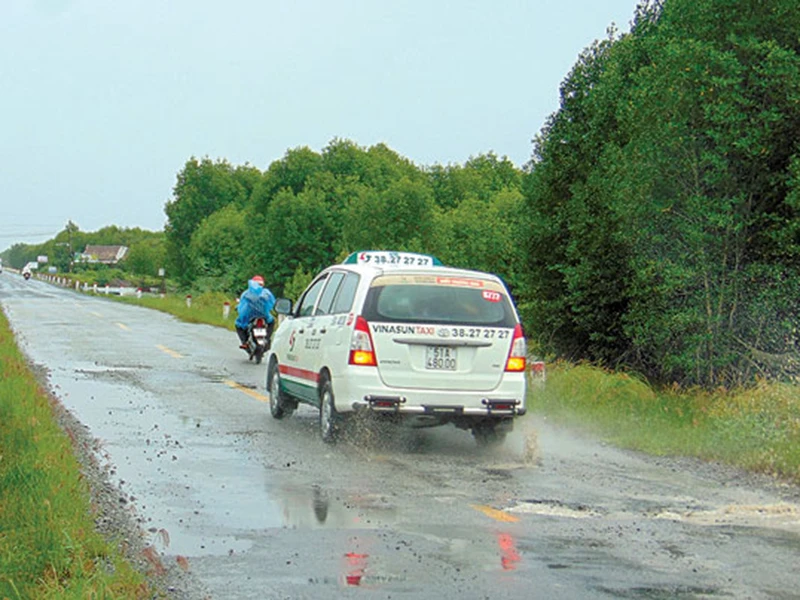 Ghi nhận của PV, ngay khúc cua gần dốc cầu Năm Căn xuất hiện một “ổ voi” rộng khoảng 1 m, sâu khoảng 20 cm, nước đọng thành vũng, chiếm gần hết làn đường dành cho xe cơ giới, xung quanh có nhiều “ổ gà” (ảnh: Gia Huy). Theo người dân ngụ xã Viên An Đông, huyện Ngọc Hiển, “ổ voi” này xuất hiện hơn một tháng nay. Ngoài ra, tại các vị trí khác như khu vực dưới dốc cầu Xóm Lò, mố cầu Ông Như... cũng xuất hiện hư hỏng, bong tróc mặt đường. “Khoảng 10 ngày nay đã có hai vụ tai nạn giao thông làm hai người bị thương nặng trên tuyến đường này. Đa số tai nạn xảy ra vào ban đêm và do người điều khiển phương tiện tự ngã” - một người dân nói.