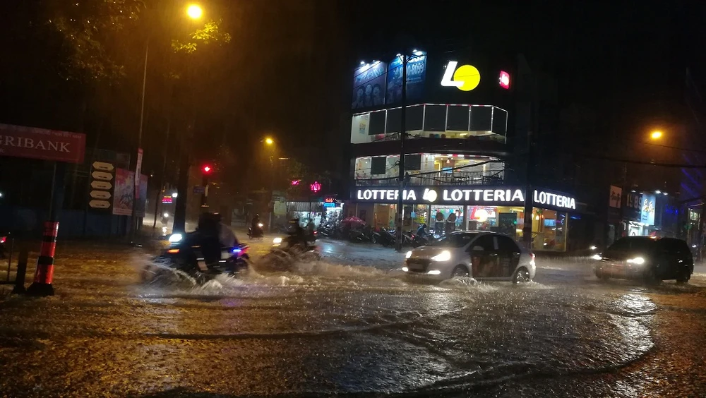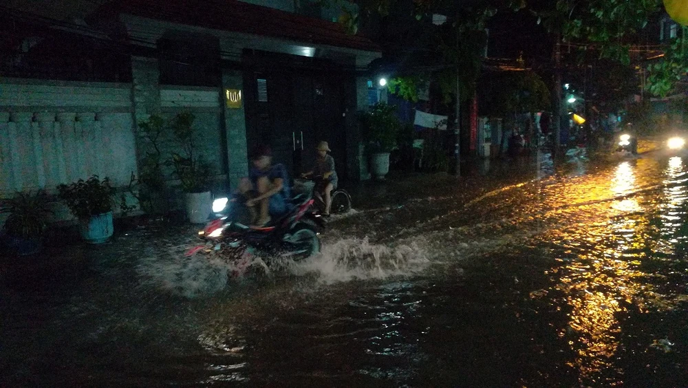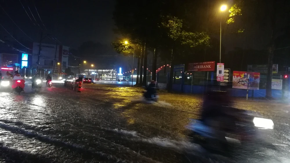 Tối 7-9, nhiều nơi trên địa bàn TP.HCM có mưa kéo dài. Ở quận Thủ Đức, sau cơn mưa gần hai tiếng đồng hồ, nhiều tuyến đường bị ngập nước sâu như Võ Văn Ngân, Kha Vạn Cân, Hồ Văn Tư... khiến nhiều người dân vấp té vì rơi vào các trũng nước sâu. Nước mưa đổ xuống liên tục khiến tầm nhìn bị che khuất, không ít người khi lọt vào những trũng nước này phải khựng lại rất lâu mới chạy tiếp được.