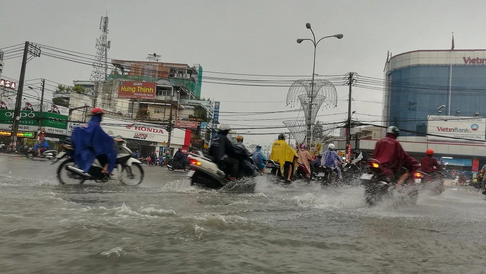 Đường Võ Văn Ngân lênh láng nước trong cơn mưa.