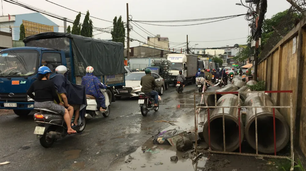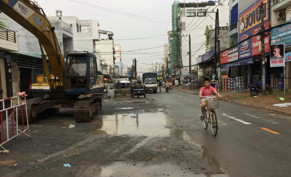 Một đoạn đường Phạm Văn Bạch, thuộc quận Gò Vấp chưa được thi công, lồi lõm, lổm nhổm hố, vũng nước gây khó khăn cho người dân đi lại