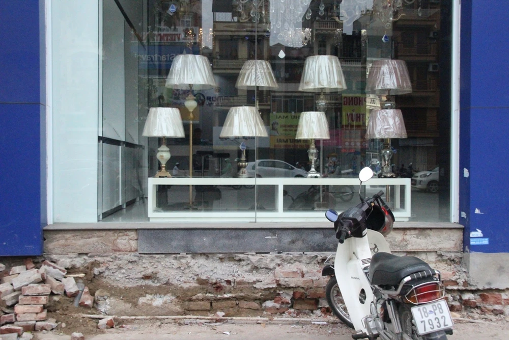 Nhiều hộ còn chưa xây lại phần diện tích bị đập phá, khiến phần phía trước căn nhà như một bãi công trường.