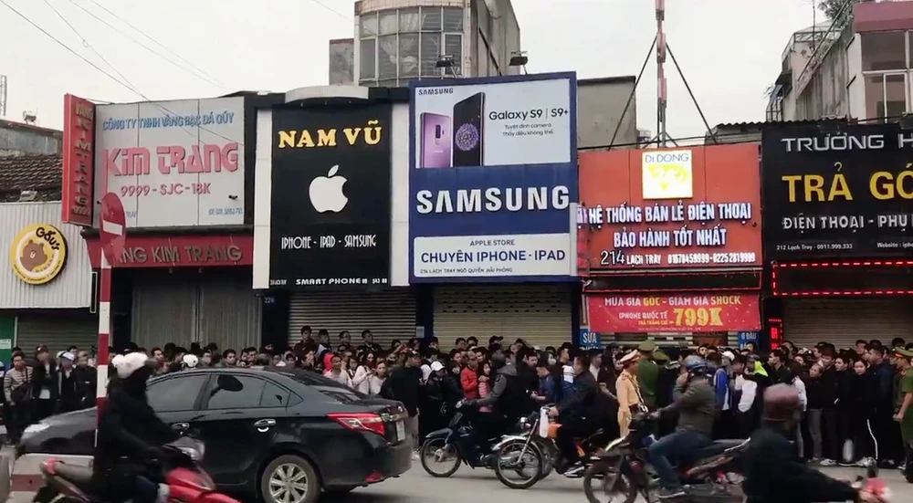 Sáng 7-4, tuyến đường Lạch Tray khu vực ngã tư Quán Mau (Hải Phòng) đã trở nên hết sức hỗn loạn khi có rất nhiều người tụ tập chờ mua điện thoại giá sốc của cửa hàng bán điện thoại V24h (số 214 Lạch Tray, quận Ngô Quyền).