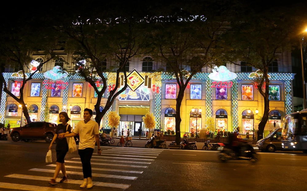 Để chào đón năm mới 2020, từ ngày 20-12, UBND TP.HCM đã triển khai trang trí ánh sáng nghệ thuật trên nhiều tuyến đường khu vực trung tâm và cửa ngõ thành phố như Nguyễn Văn Trỗi, Nam Kỳ Khởi Nghĩa, Lê Duẩn - vòng xoay Lê Duẩn, Nguyễn Huệ...Trong ảnh: Trung tâm thương mại Diamond (quận 1) trang trí nhiều tiểu cảnh Tết từ nhiều ngày nay.