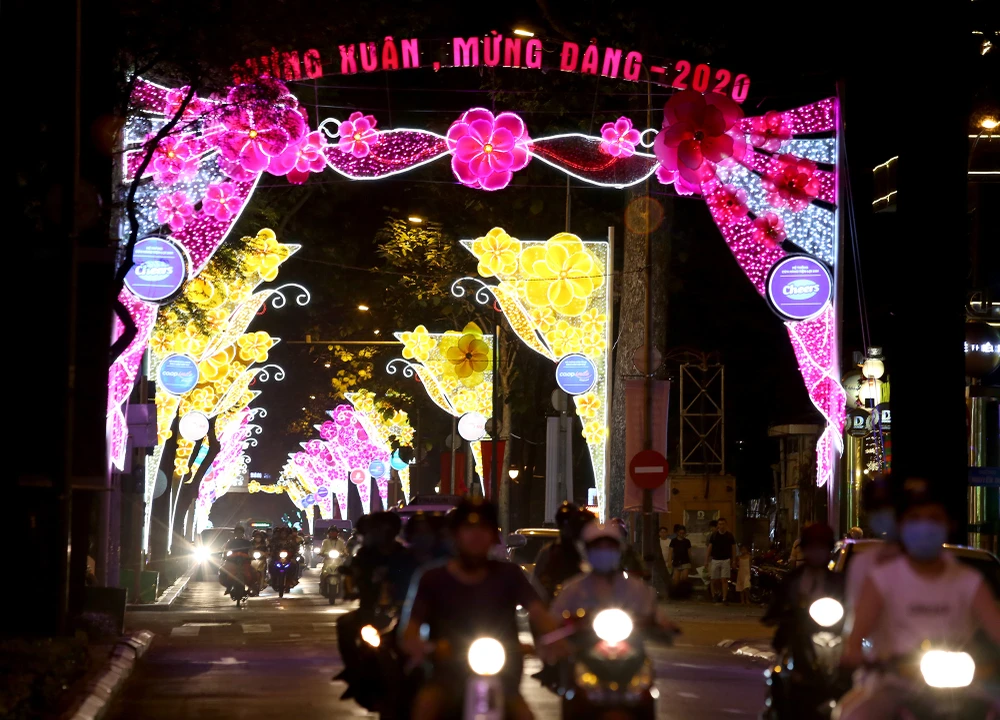 Đường Nam Kỳ Khởi Nghĩa được trang trí kiểu đèn hoa với hình ảnh hoa mai truyền thống.