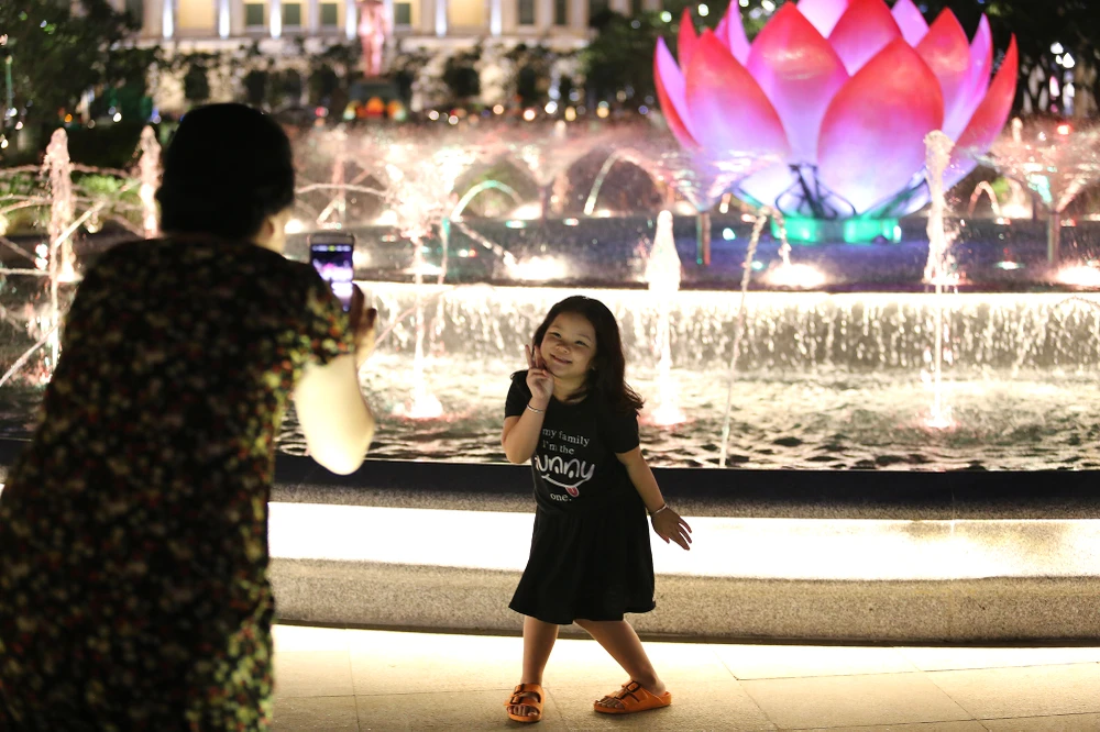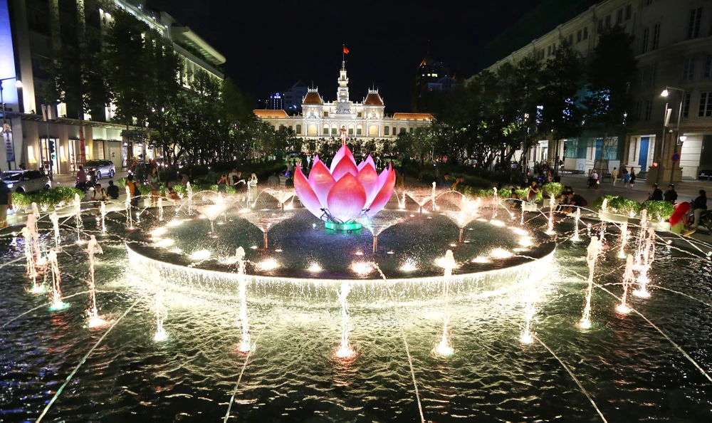 Đài phun nước nghệ thuật tại phố đi bộ Nguyễn Huệ cũng được thắp sáng lung linh.