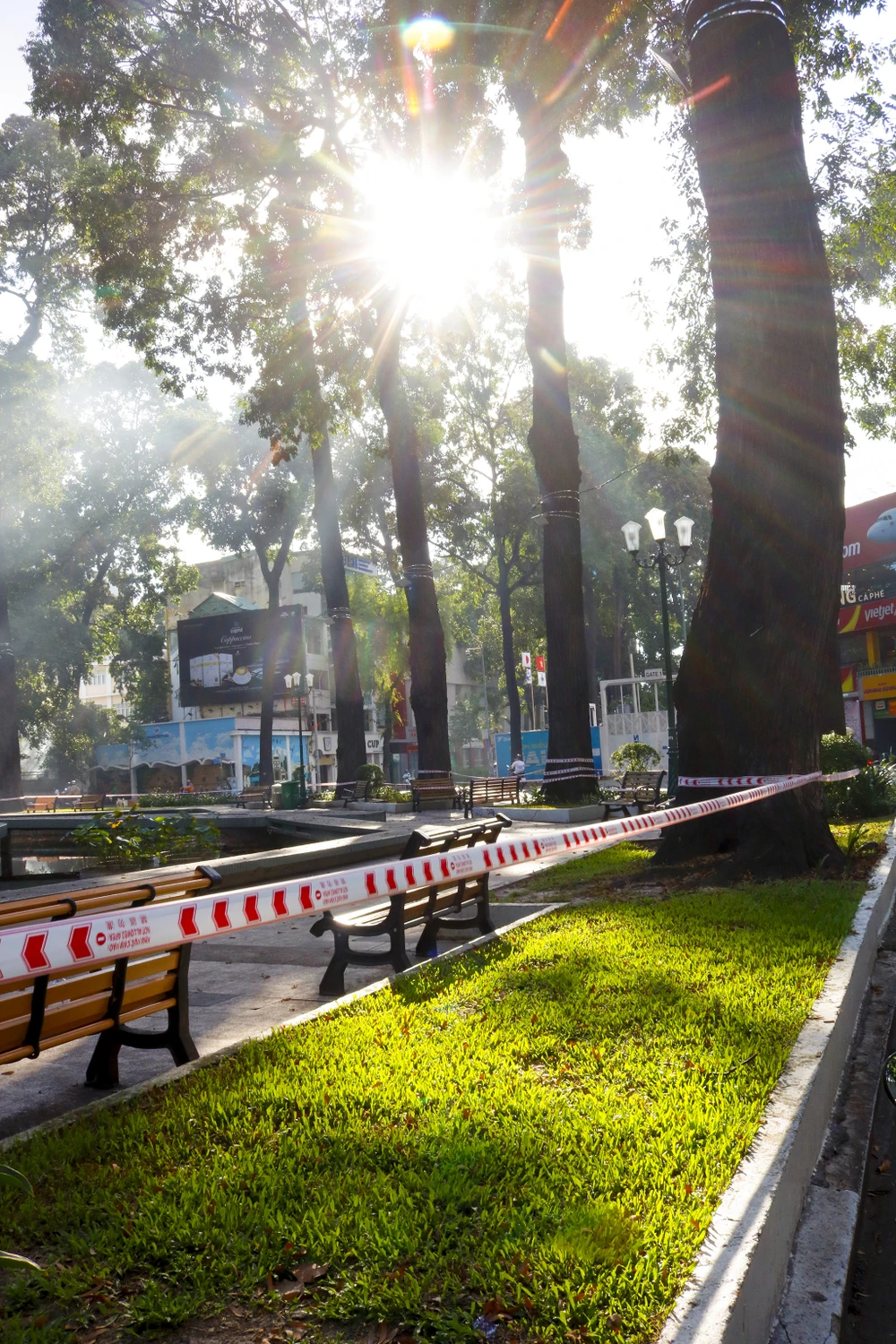 Khu vực Hồ Con Rùa (quận 1) đã được giăng giây để hạn chế tập trung đông người.