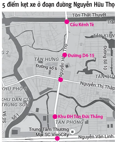Vào cao điểm sáng-chiều, các giao lộ đường số 15, Nguyễn Thị Thập với đường Nguyễn Hữu Thọ luôn là điểm nóng về kẹt xe. Hiện đường Nguyễn Hữu Thọ tại đoạn này mới chỉ có bốn làn xe, mỗi chiều đi-về hai làn không còn đủ đáp ứng lượng người, xe lưu thông. Cùng với đó, các đường số 15 và Nguyễn Thị Thập đổ vào Nguyễn Hữu Thọ không thể mở rộng lên nữa. Vì thế mỗi lần các giao lộ trên bị kẹt là kéo theo kẹt liên hoàn trong nhiều giờ trên cả khu vực.