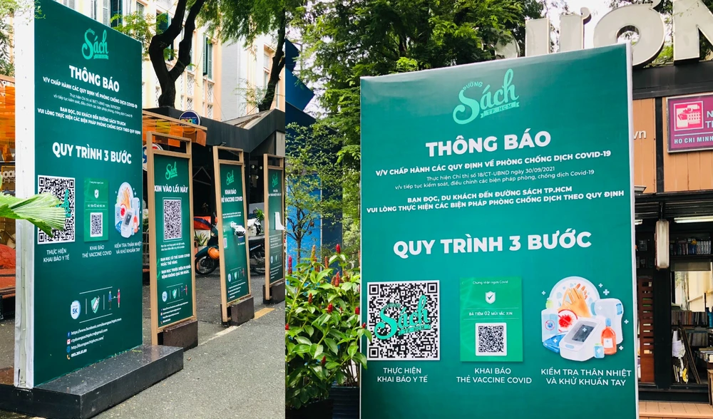 Đường Sách bố trí bảng thông tin hướng dẫn bạn đọc vào Đường Sách tại 2 đầu đường. Kiểm soát chặt chẽ từ 2 đầu cổng để hạn chế tập trung đông người, yêu cầu thực hiện nghiêm 5K. Cụ thể, tại mỗi đầu đường, Đường Sách bố trí một lối vào, một lối ra duy nhất, bạn đọc đủ điều kiện Thẻ xanh Covid/Thẻ xanh Covid giới hạn phạm vi hoạt động/F0 khỏi bệnh trong 180 ngày đứng xếp hàng giãn cách 2m theo quy định; có camera để quét mã QR…