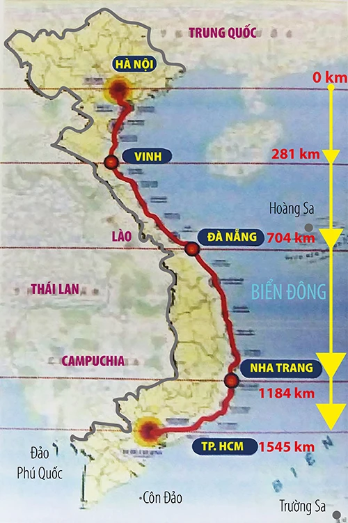 Hướng tuyến đường sắt tốc độ cao có điểm đầu là Hà Nội và điểm cuối là TP.HCM, chiều dài 1.545 km. Đồ họa: H.TRANG