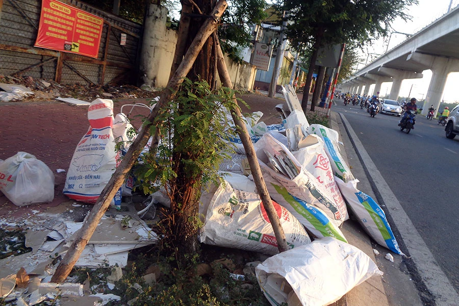 Một đoạn vỉa hè trên đường song hành Xa lộ Hà Nội, phường Bình Thọ, TP Thủ Đức, TP.HCM đang trở nên nhếch nhác đầy cỏ, củi khô vứt bỏ từ lâu, kính hỏng (ảnh trên). Và nay càng thêm nhếch nhác bởi những bao rác là thất thải rắn từ việc sửa chữa nhà đổ trộm ở đây (ảnh dưới). Những hình ảnh này không chỉ làm ô nhiễm môi trường mà còn làm mất mỹ quan đô thị.