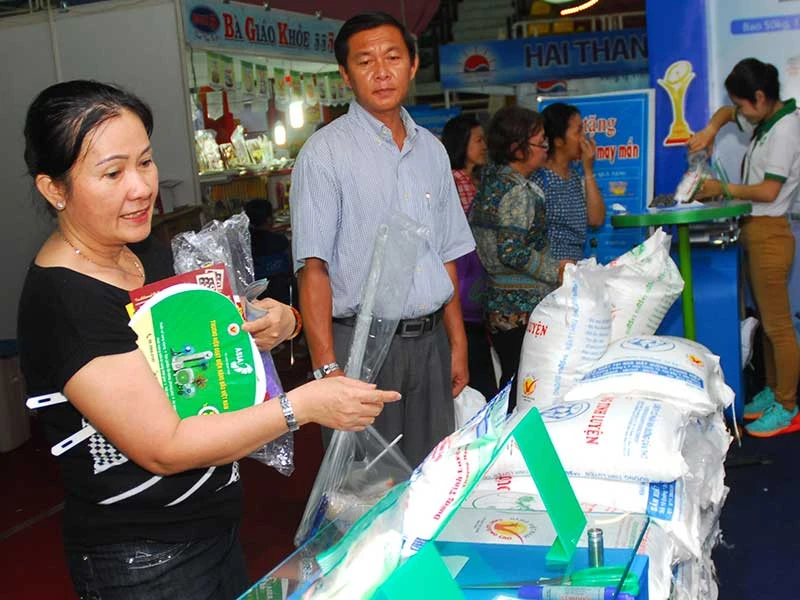 Thời gian qua giá đường dao động 16.600-17.800 đồng/kg, tùy loại. Trong ảnh: Mua bán đường tinh luyện tại hội chợ hàng Việt Nam chất lượng cao. Ảnh: HTD