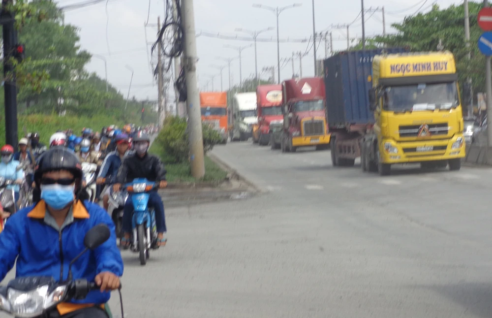 Trên đường Nguyễn Thị Định, xe máy và xe container vẫn nườm nượp xuống phà Cát Lái và Tân Cảng - Cát Lái.