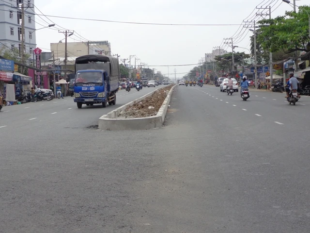 Những ngày qua, các đơn vị thi công đã tập trung cho trải nhựa mặt đường ở hai chiều nhưng hạng mục trồng hoa, cây cảnh trong bồn dải phân cách vẫn trơ đất đỏ, bụi bay. Hạng mục này phải chờ qua tết mới thi công.