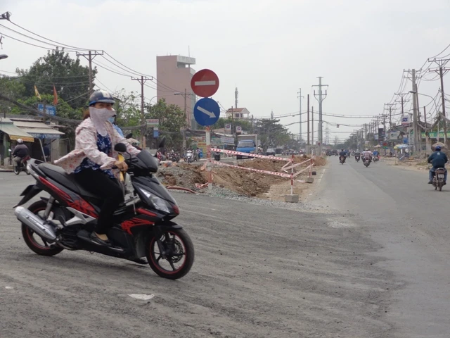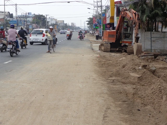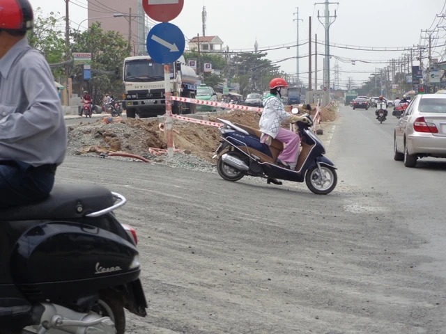 Ở đoạn này, bên tay trái đã làm xong phần đường có độ cao vượt trên mặt đường cũ bên tay phải từ 60 đến 80 cm, tạo thành con dốc lên xuống giữa hai phần đường.