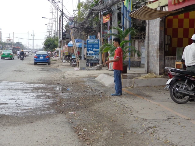 Vỉa hè ở cả hai chiều đường vẫn ngổn ngang máy móc, đất cát.