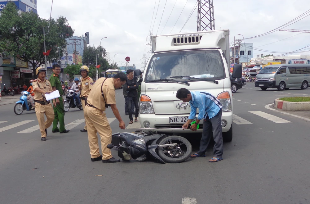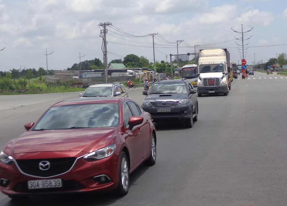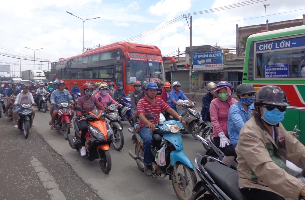 Đến hơn 15 giờ chiều nay (2-9) dòng xe các loại đổ về miền Tây qua cầu Bình Điền vẫn còn đông, tốc độ lưu thông qua đây có phần chậm lại vì vừa đổ dốc cầu là gặp ngay ngã tư đèn đỏ quốc lộ 1 - Nguyễn Hữu Trí