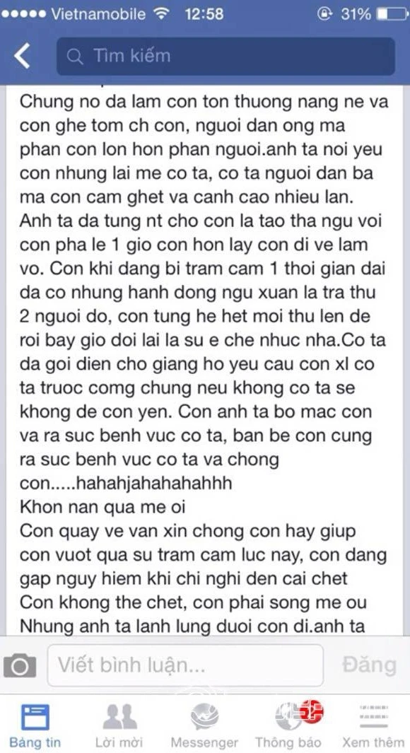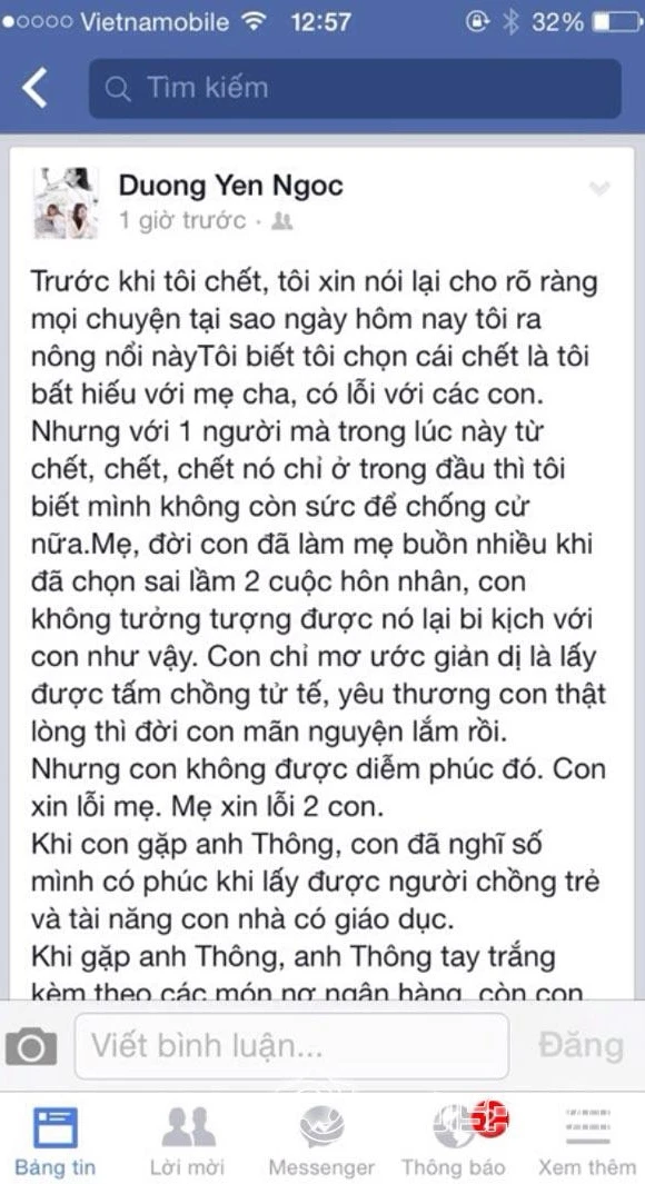 Cách đây vài phút, cựu người mẫu Dương Ngọc Yến chia sẻ trên trang cá nhân dòng tâm trạng khá dài với nội dung "tâm thư" gửi đến mẹ mình, trong đó cô luôn nhắc đến chuyện muốn chết vì trầm cảm nặng và không còn sức chống cự.