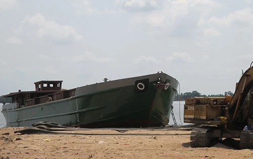 Chiếc sà lan đang hạ thủy thì xảy ra tai nạn.