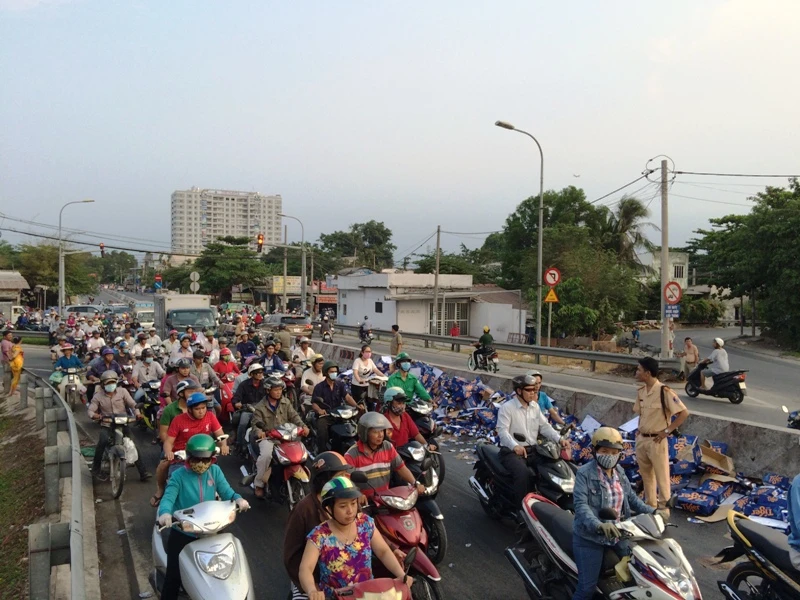 Hàng trăm thùng bia đổ xuống dốc cầu vượt Gò Dưa chiều 27-4