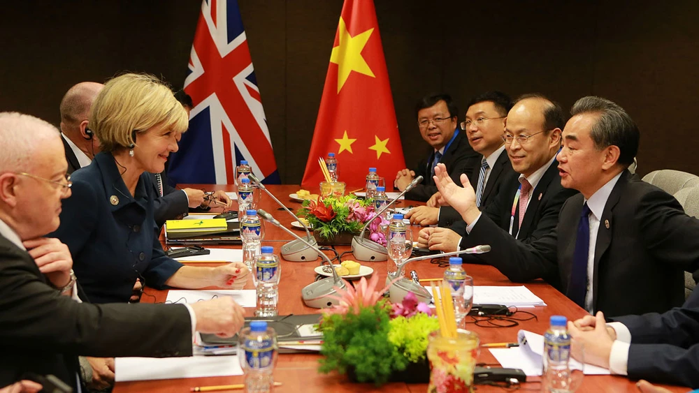 Phái đoàn ngoại giao Úc (trái) và Trung Quốc (phải) trong một phiên đối thoại song phương ở thủ đô Canberra hồi tháng 6-2018. Ảnh: AP