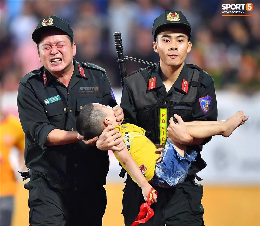 Tối 4-8, báo chí, mạng xã hội đồng loạt đưa hình ảnh về chiến sĩ cảnh sát cơ động trên sân vận động Thiên Trường (Nam Định) hỗ trợ một bé trai bị co giật đi cấp cứu.