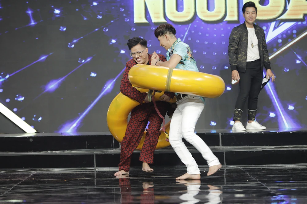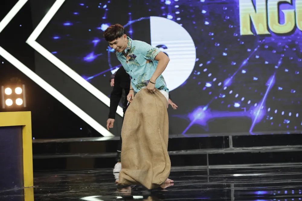 Độ khó của trò chơi lại tăng thêm một bậc khi MC yêu cầu hai người chơi sẽ phải nhảy chung 1 chiếc bao bố.
