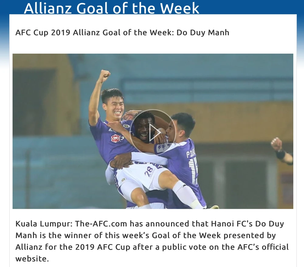 Pha lập công từ cự ly hơn 30 mét của Đỗ Duy Mạnh (Hà Nội FC) tại AFC Cup đoạt giải Bàn thắng đẹp nhất tuần. Thông báo vừa được đăng trên trang chủ The-AFC.com.