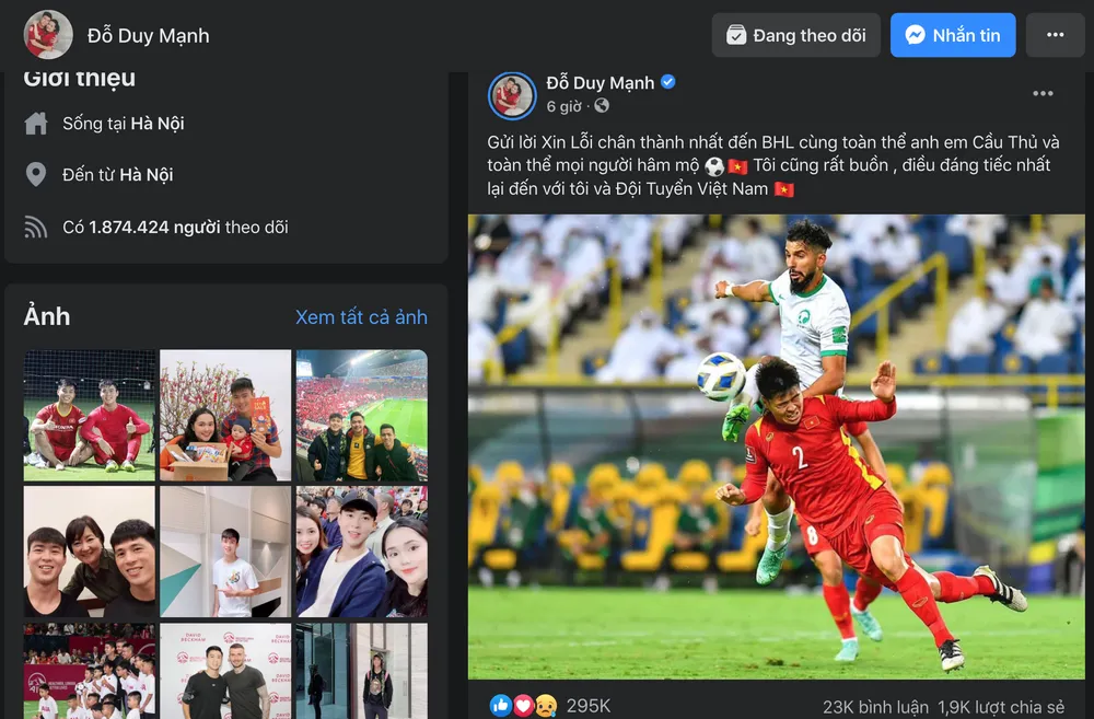 Bài viết cầu thủ người Hà Nội hiện thu hút sự tương tác cực lớn với hơn 24.000 bình luận (comment) cùng hơn 21.000 lượt chia sẻ (Share) từ những người hâm mộ bóng đá Việt Nam.