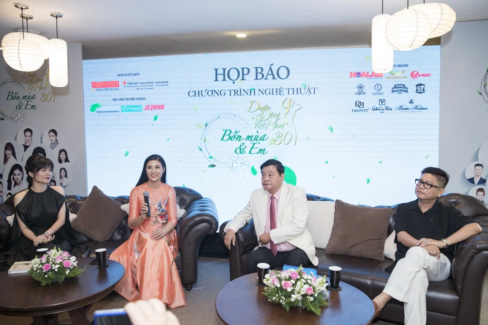 Từ phải qua: Đạo diễn Binh Hùng, nhà báo Nguyễn Công Khế, hoa hậu Ngọc Hân trả lời về chương trình.